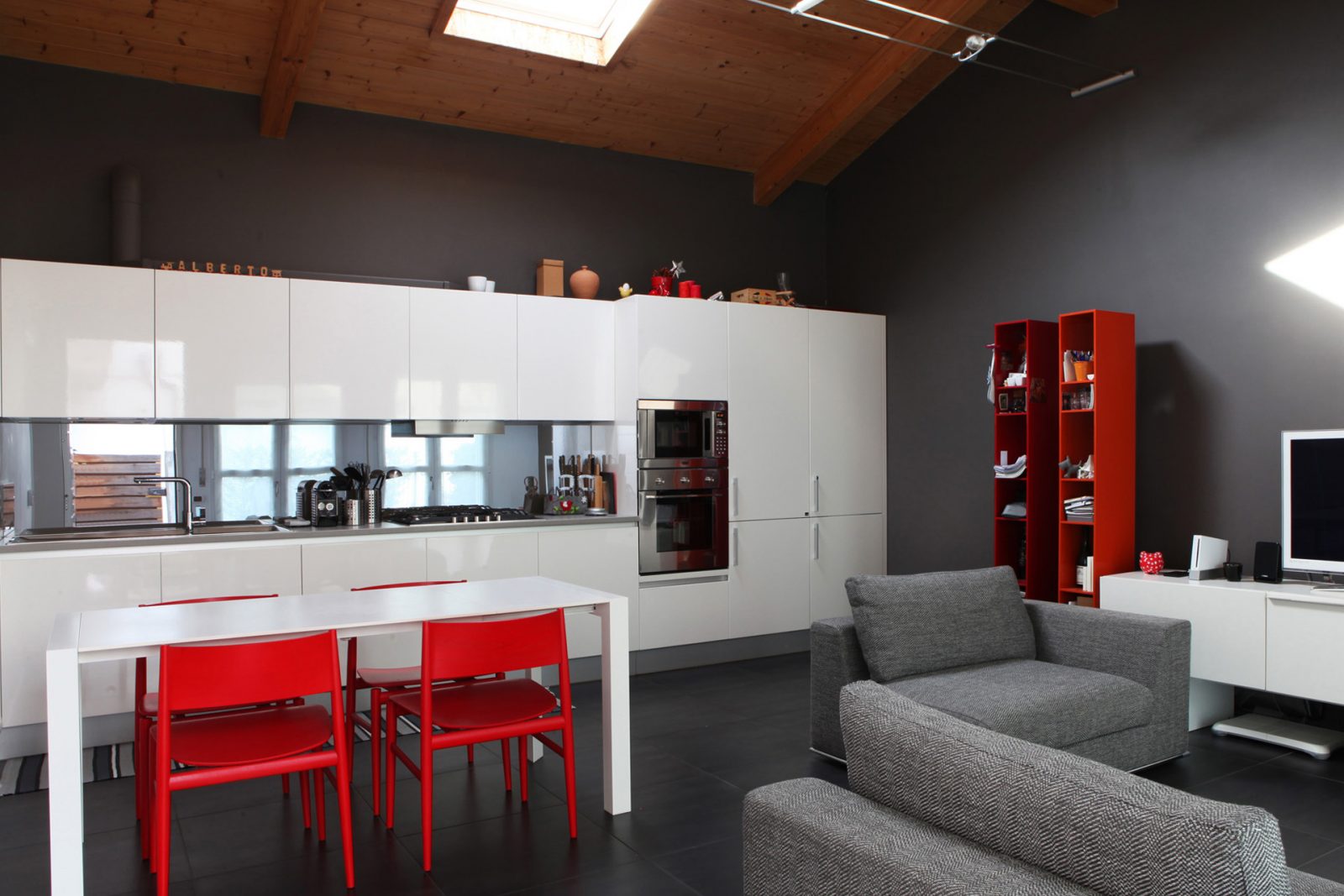 Quando a far da padrone è un bellissimo soffitto con travi in legno come questo bisogna studiare un arredo all’altezza. La cucina laccata bianca lineare si apre verso lo spazio del living, giocando con la luce con lo schienale in vetro specchiante.Il tavolo allungabile si sposa con le diverse esigenze di spazio. Il soggiorno essenziale ma di carattere completa una zona giorno conviviale e ariosa.