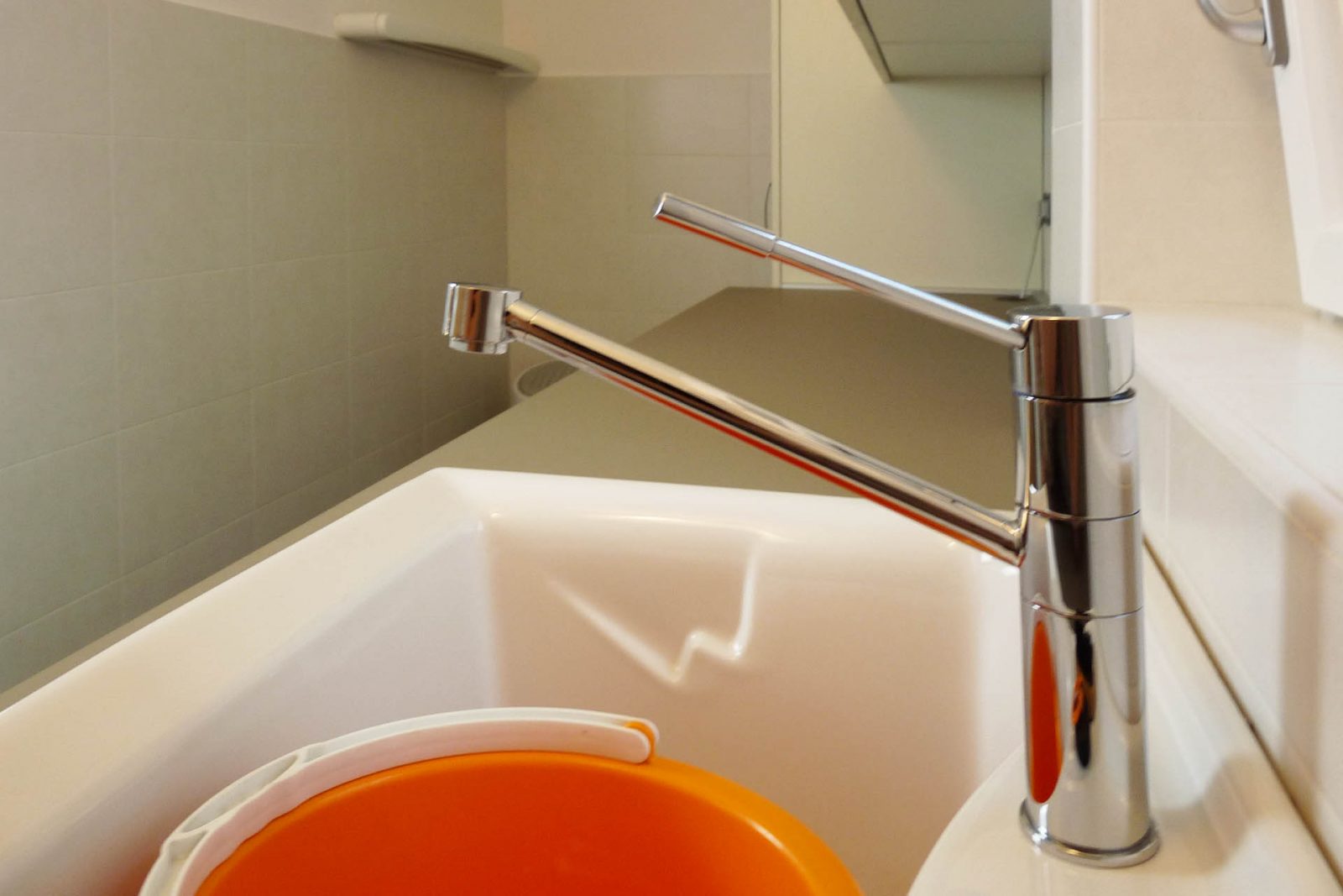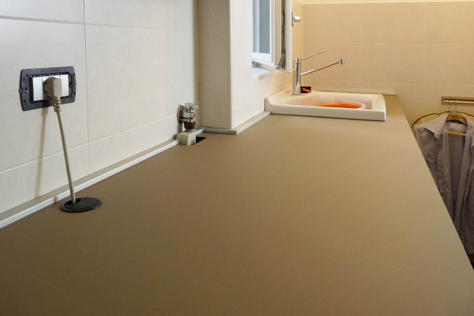 Studiare con cura gli ambienti di servizio come la lavanderia a casa, è il modo migliore per vivere serenamente i propri spazi. La lavanderia deve essere pratica e funzionale, in materiali resistenti e durevoli nel tempo. La lavatrice e l’asciugatrice trovano la loro collocazione sotto il piano di lavoro accanto al lavatoio incassato. L’anticamera è sfruttata come svuota tasche per l’ingresso, oltre che armadio per gli ospiti e scarpiera. Tutti gli spazi sono studiati su misura, dalle ante a specchio ai particolari come gli interruttori riportati sul cassetto.