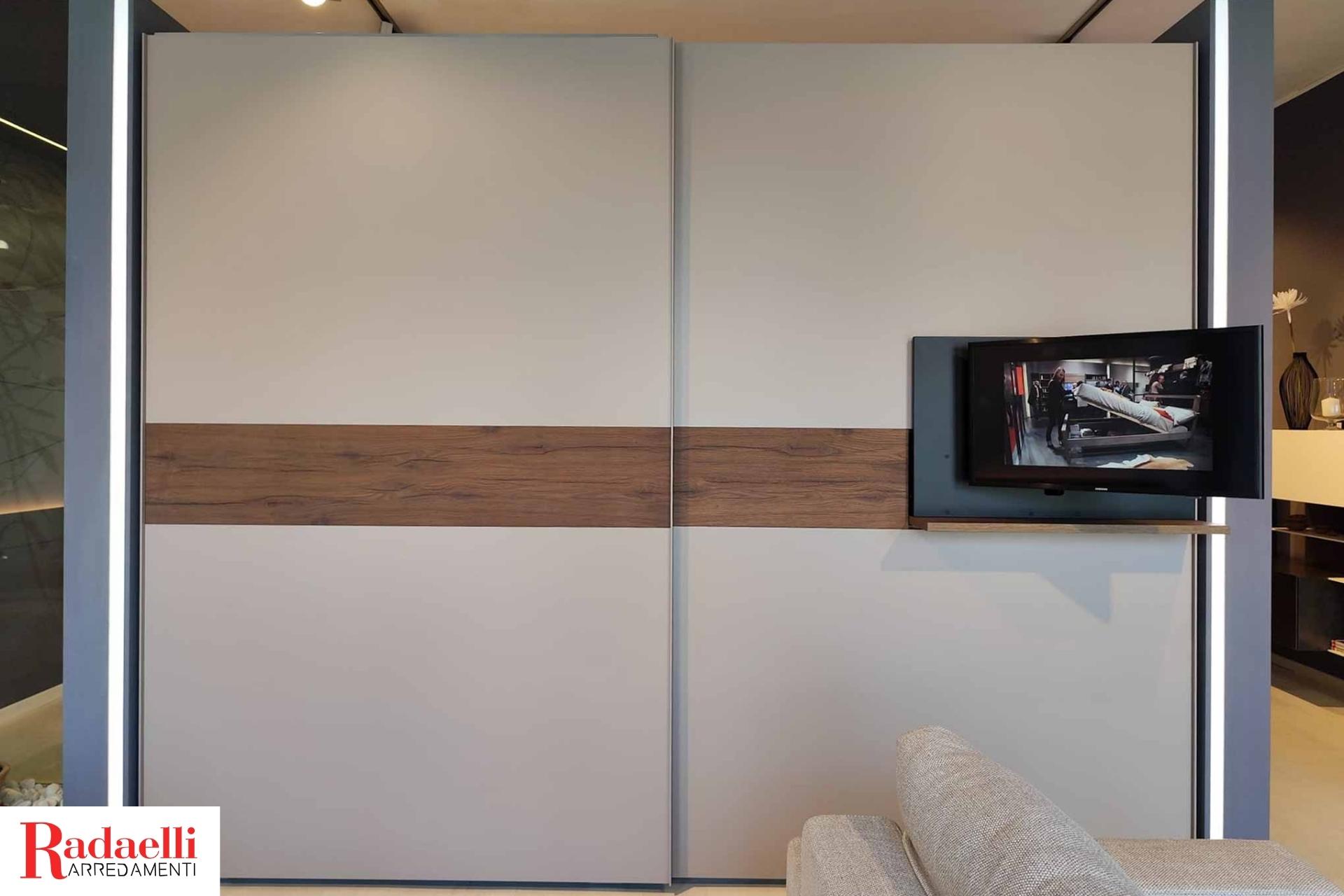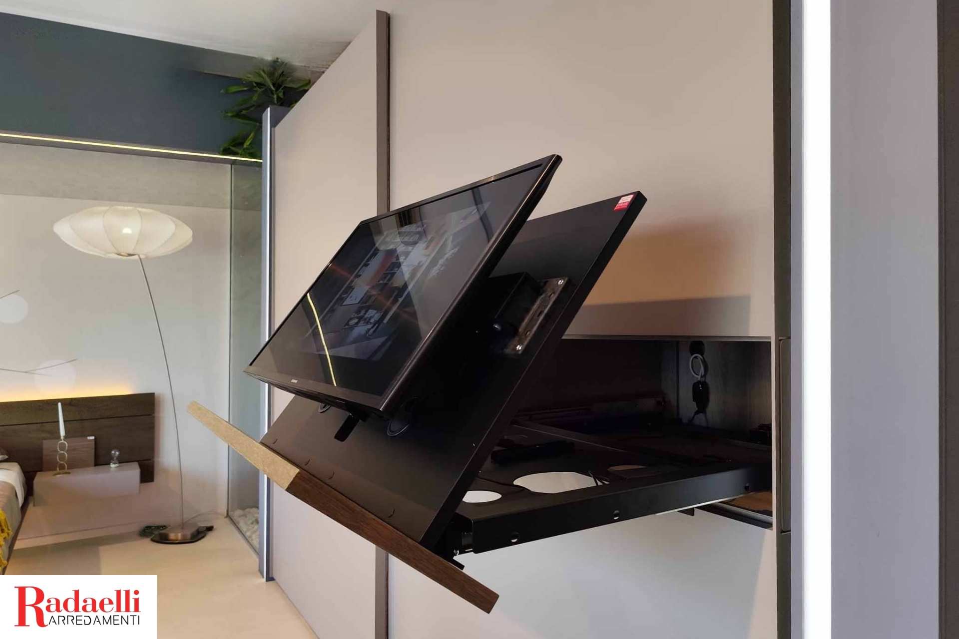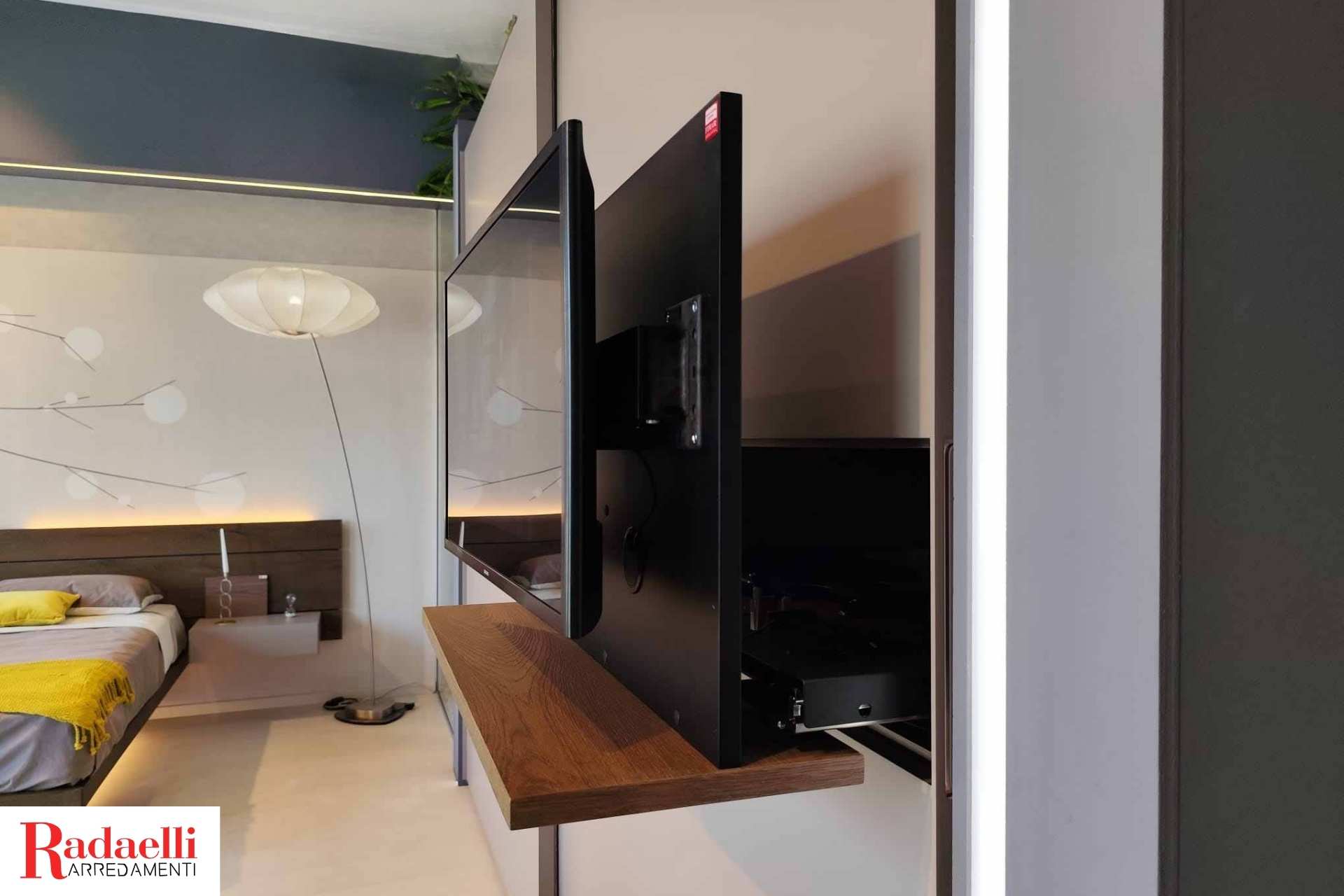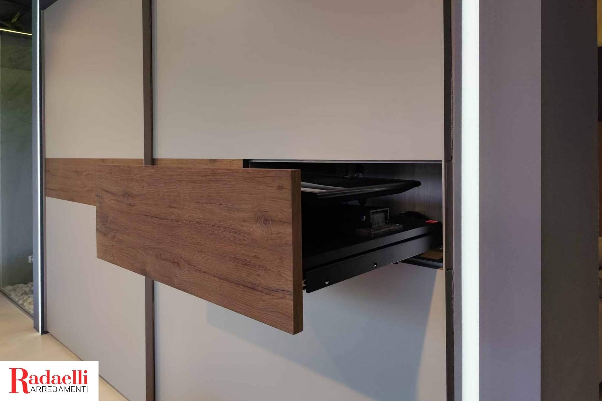 L’armadio scorrevole Strip Fimar rappresenta l’incontro perfetto tra design moderno e funzionalità avanzata. Dotato di un innovativo porta TV Ghost brevettato, questo armadio integra la tecnologia nel tuo spazio abitativo, permettendo di orientare il televisore secondo le tue esigenze. Le ante scorrevoli, realizzate in laccato color sabbia con un elegante inserto in legno quercia, conferiscono un tocco di raffinatezza e calore all’ambiente.