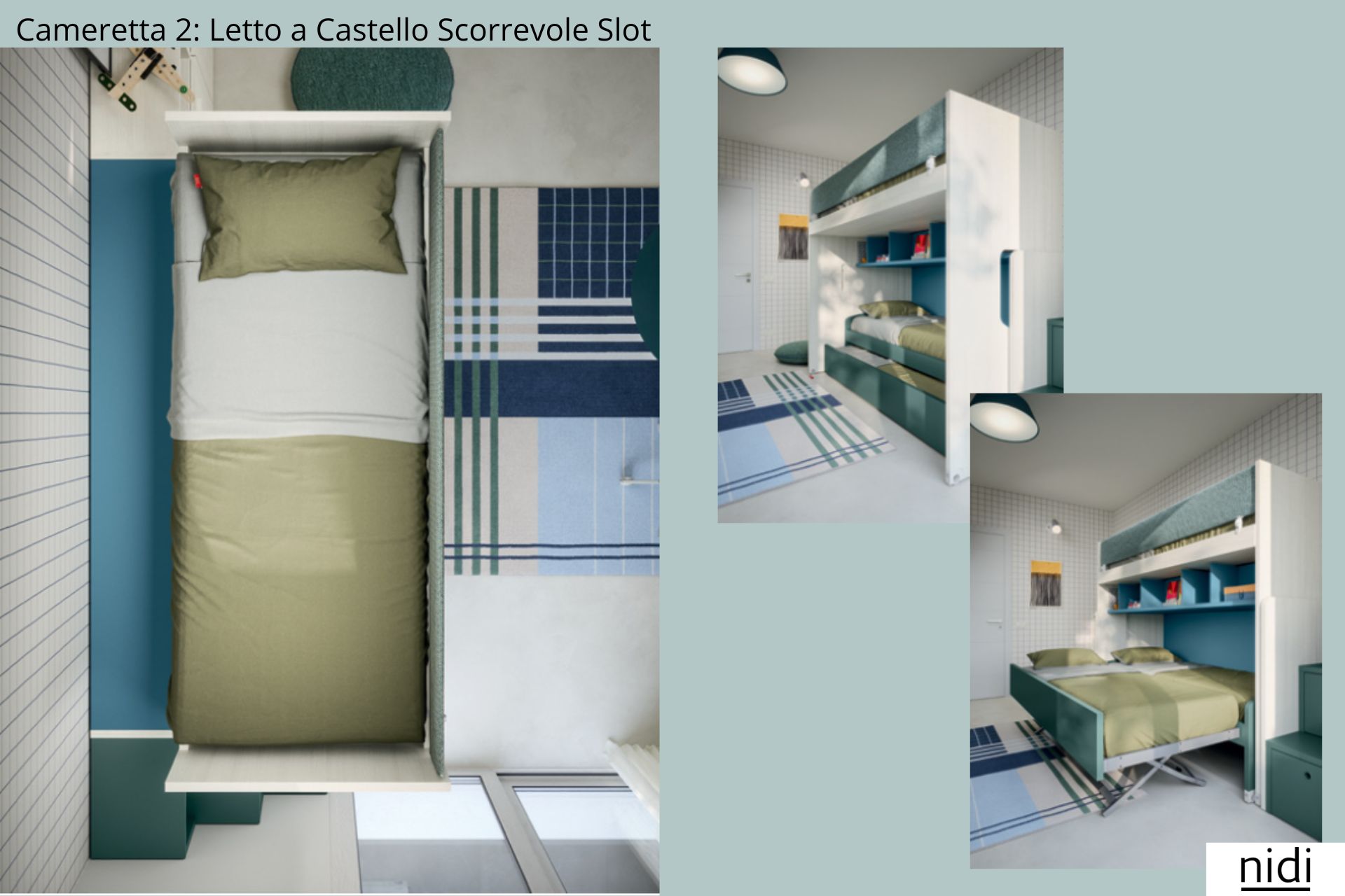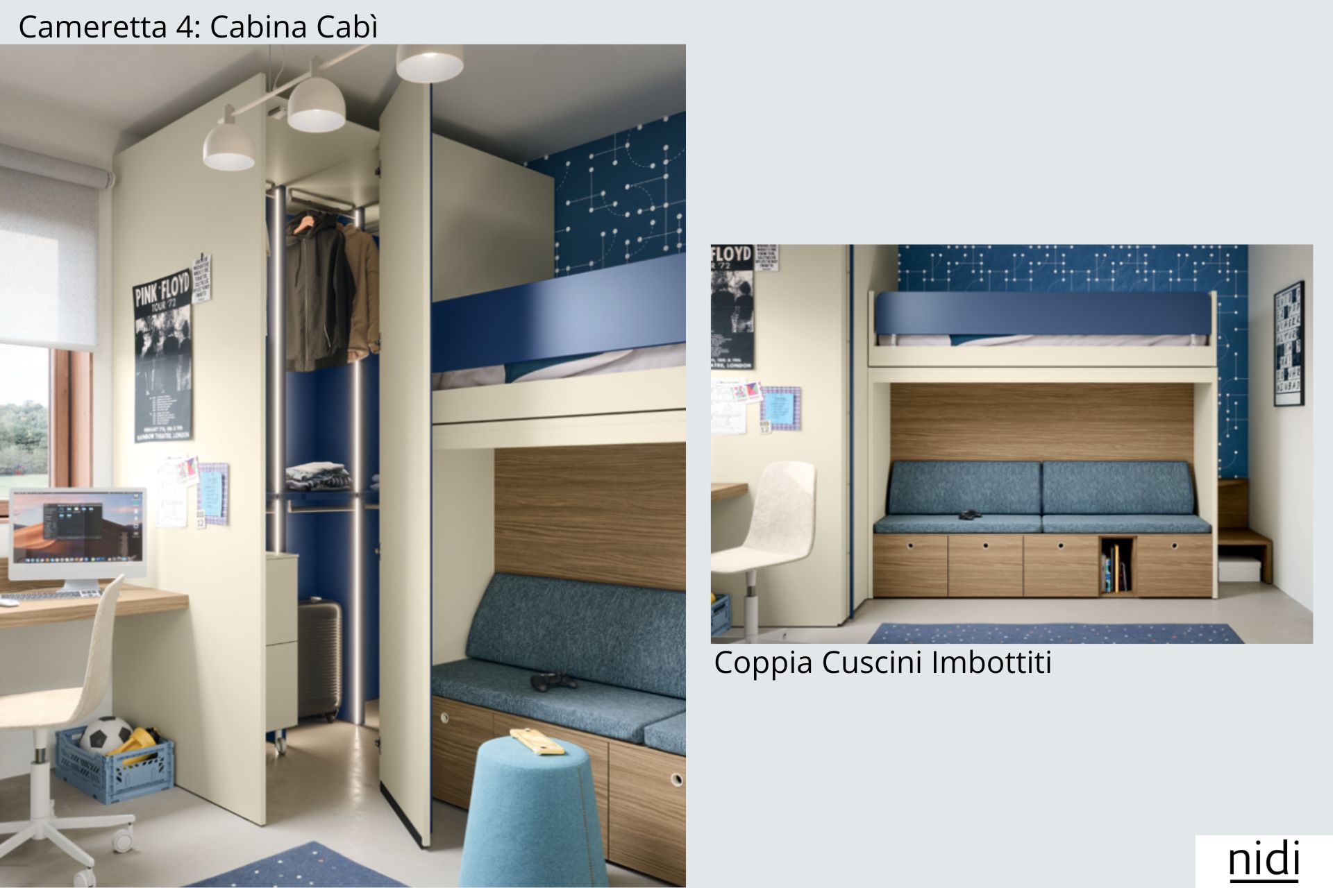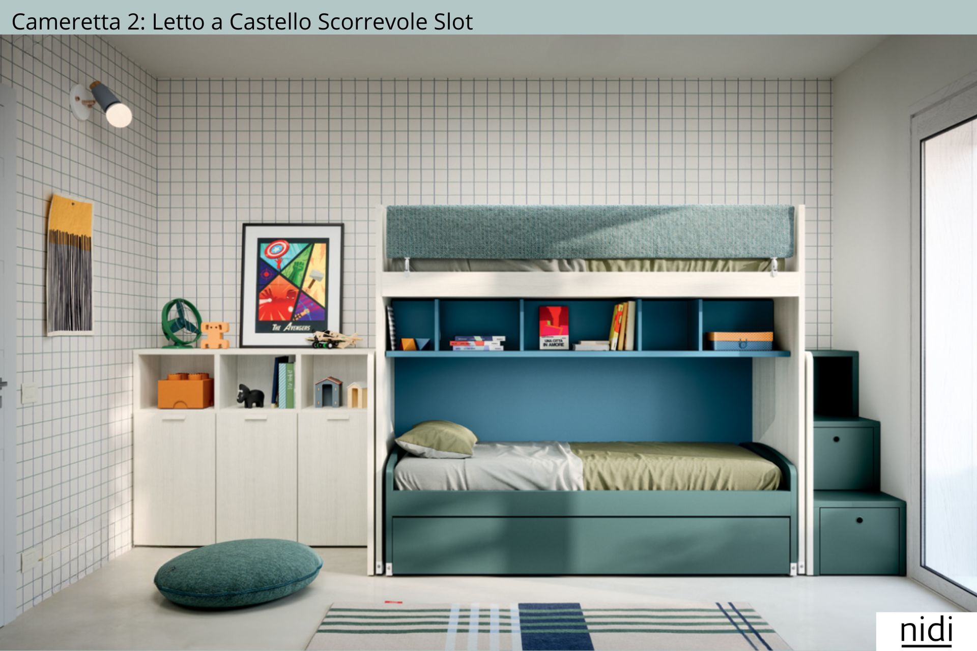 Ti proponiamo le camerette a castello dei marchi Nidi e Mariani Plus, moderne, colorate e altamente personalizzabili, pensate per crescere con il bambino e adattarsi ai suoi cambiamenti. I letti a castello possono essere integrati con scrivanie, contenitori, librerie e armadi, creando un ambiente dinamico e accogliente.Ogni progetto è realizzato su misura, con attenzione alla sicurezza e all’ergonomia.