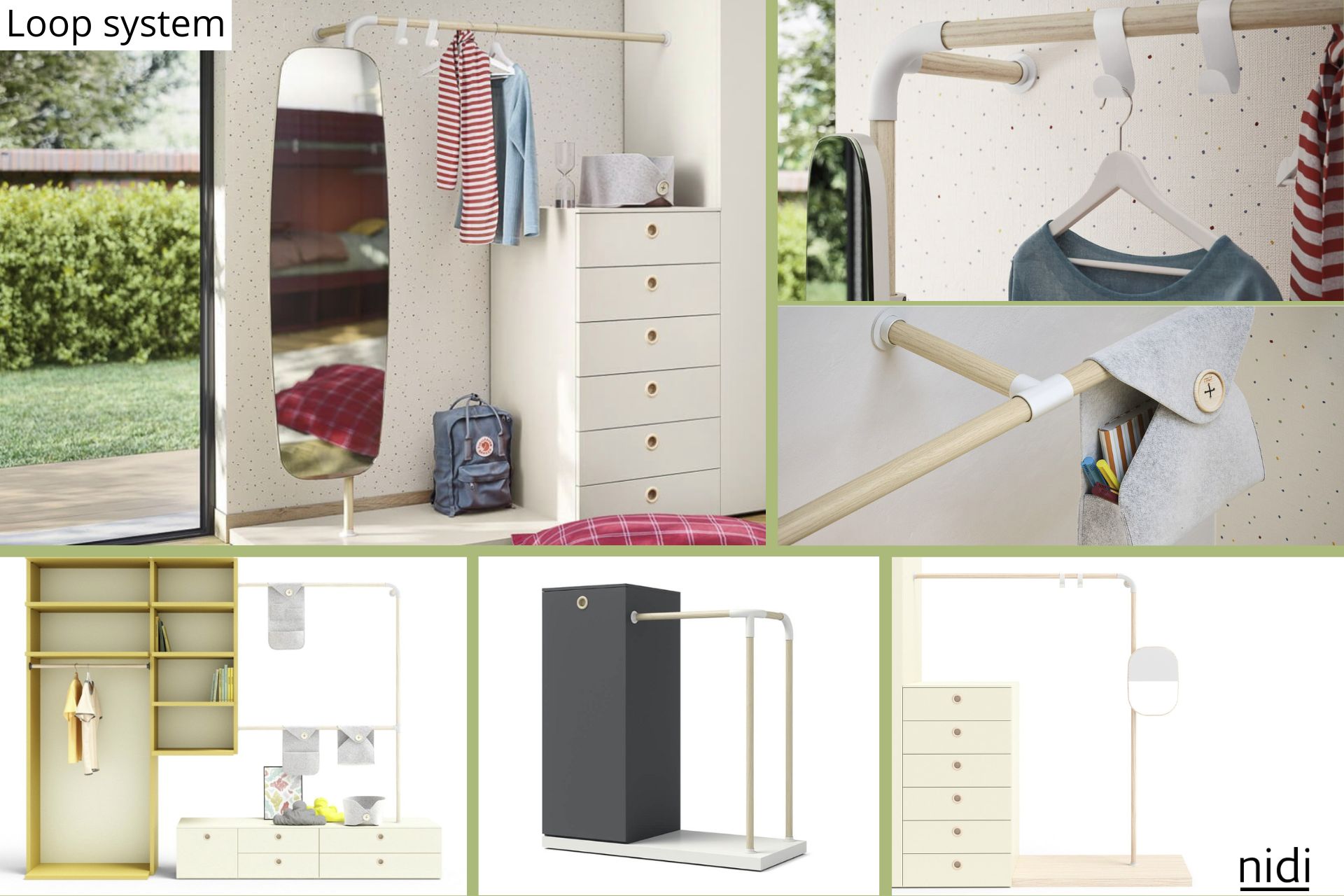 Non mancano i contenitori, veri alleati dell’ordine quotidiano, disponibili in varie forme e dimensioni per adattarsi a ogni angolo della stanza. Un elemento innovativo e unico è il sistema a palo Loop di Nidi: una struttura modulare e multifunzione che può essere attrezzata con mensole, specchi, appendiabiti, porta zaini o librerie. Loop si adatta perfettamente allo spazio, permettendo di creare soluzione adatte alle esigenze.