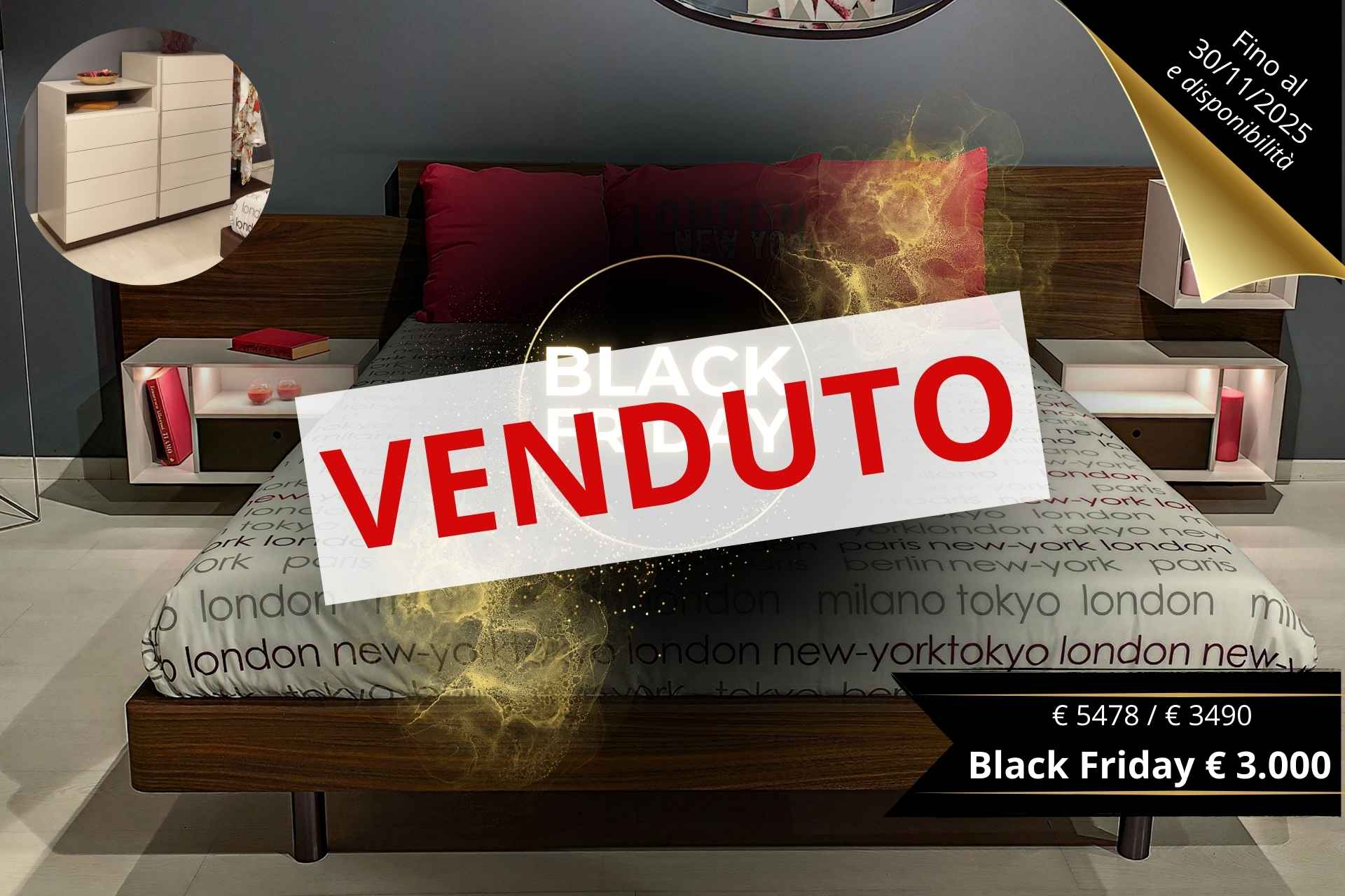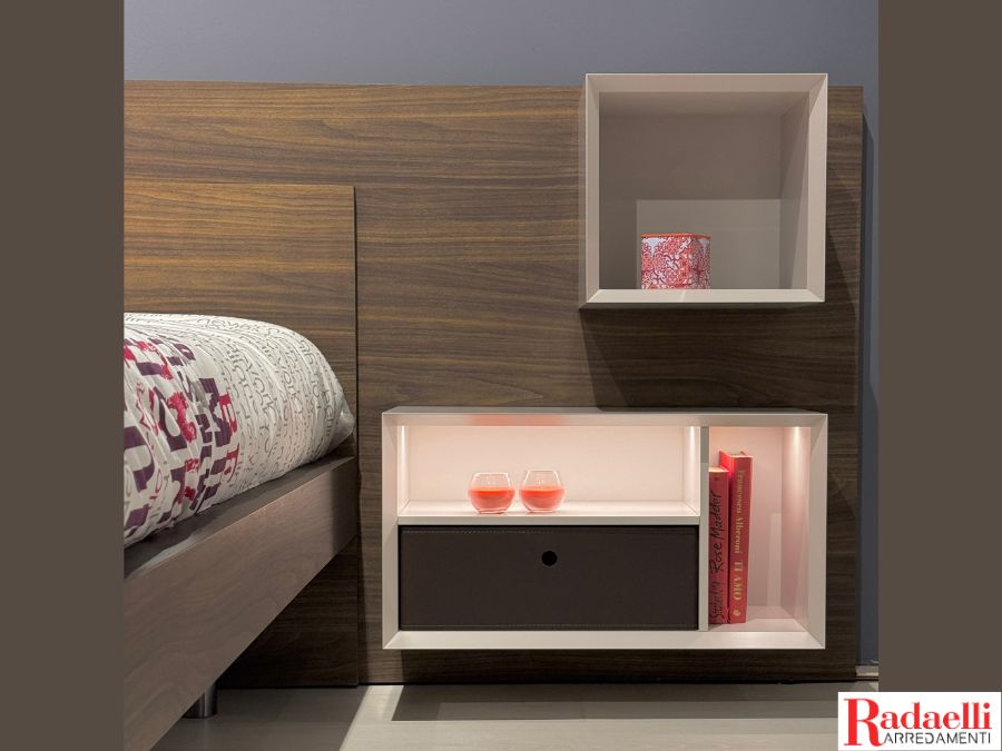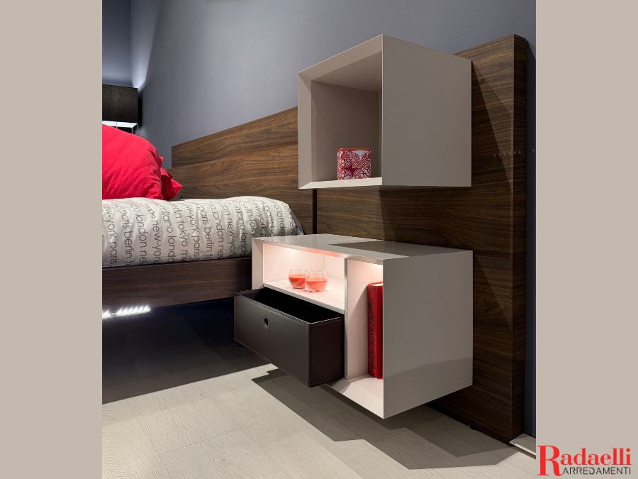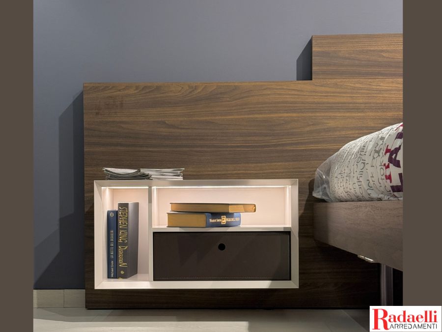 Il letto matrimoniale si distingue per la testata raffinata in effetto legno color noce, che incornicia i comodini sospesi, offrendo praticità e leggerezza visiva.