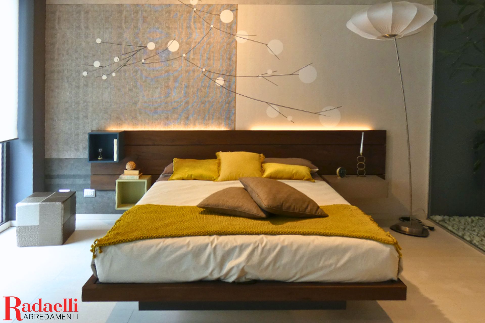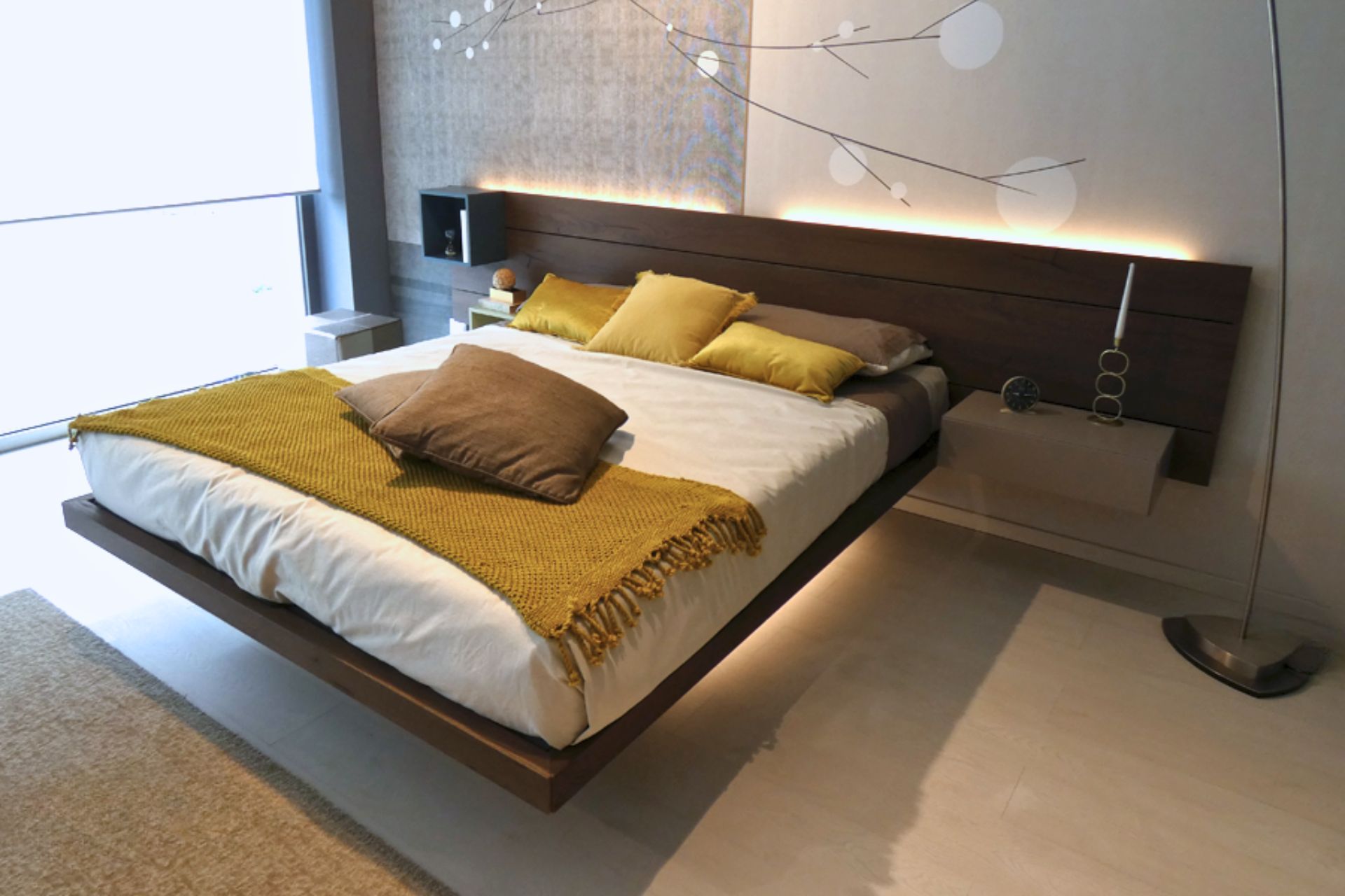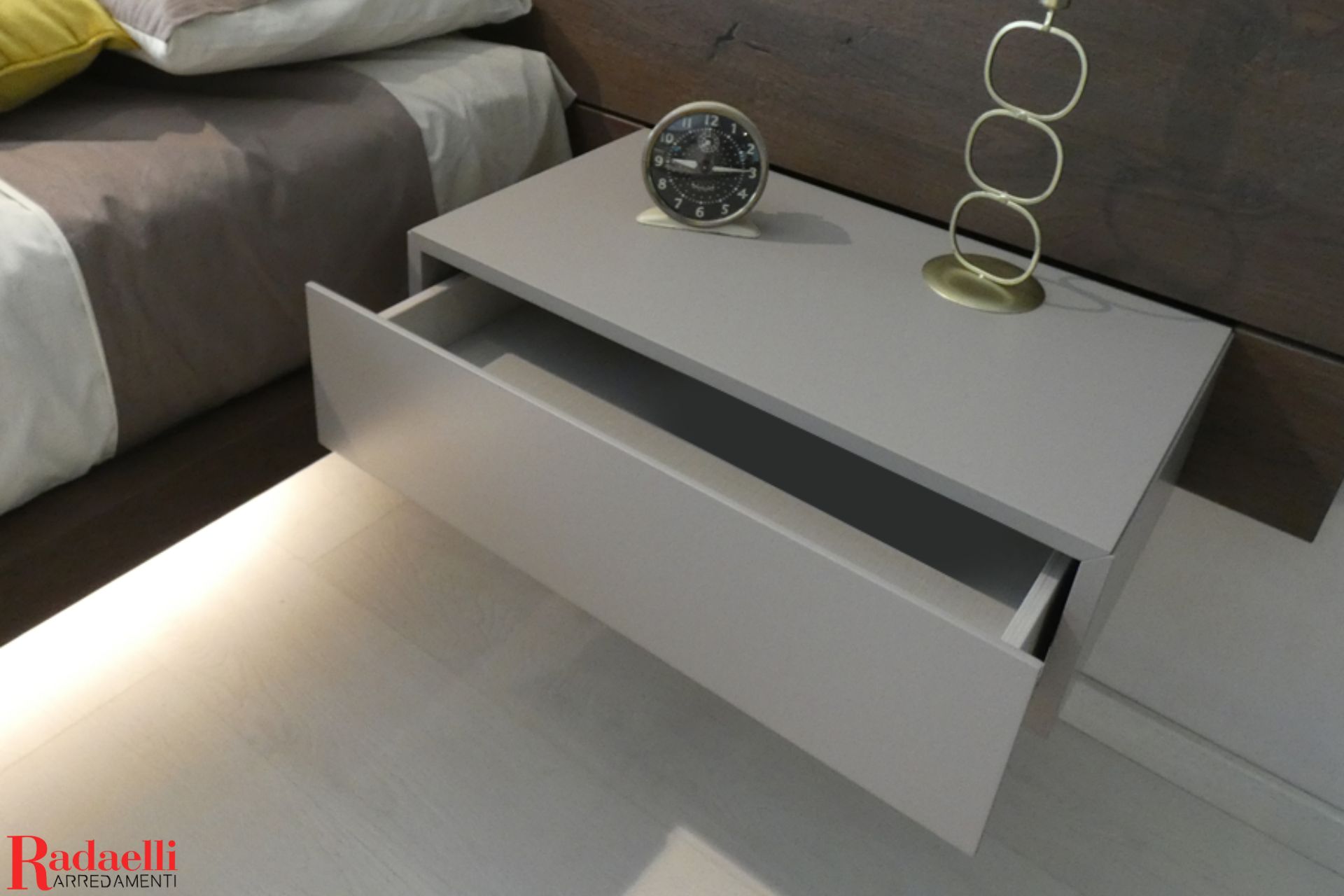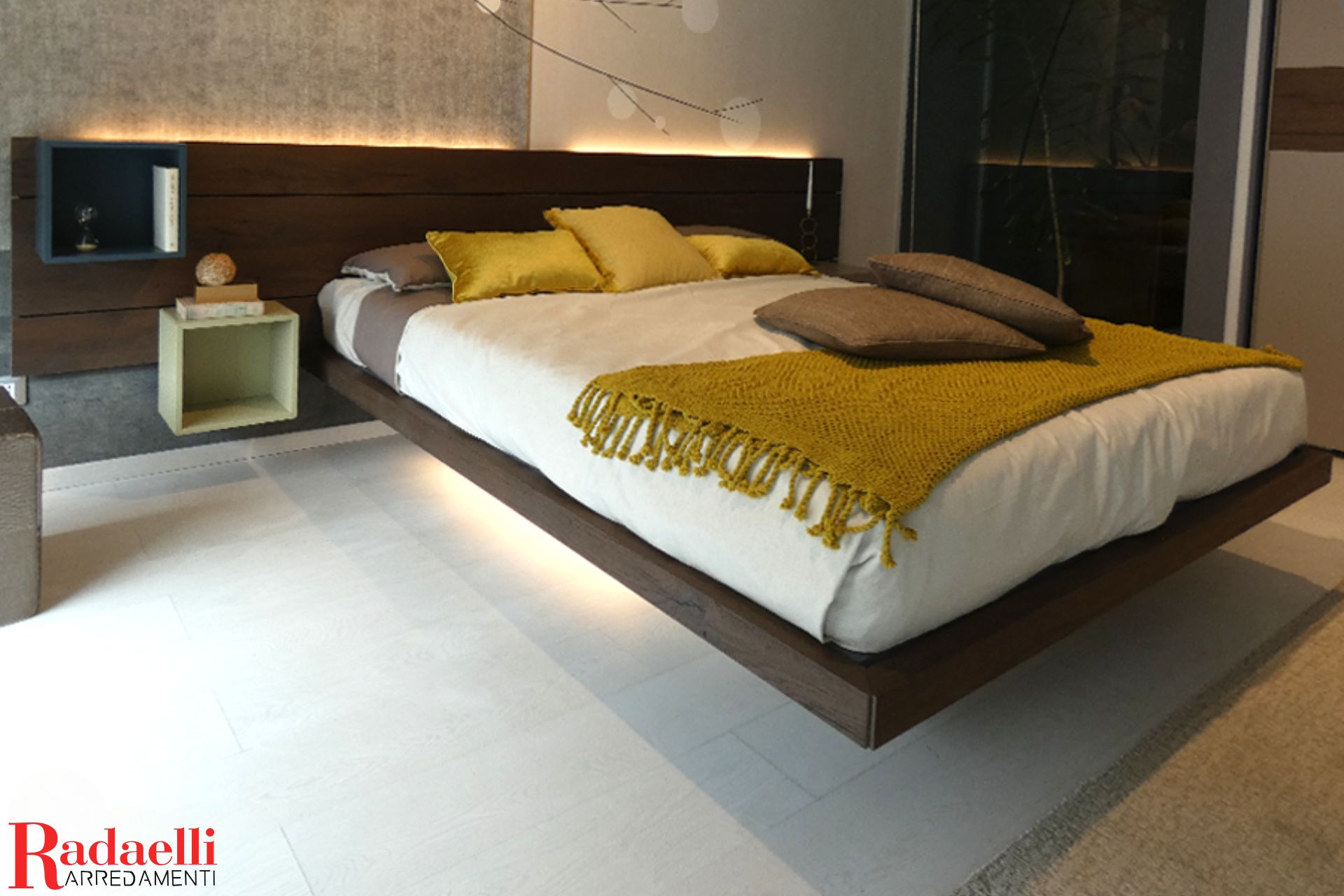 Un ulteriore tocco scenografico è dato dalle luci integrate: poste sopra la testata e sotto il letto, creano un effetto sospeso e donano leggerezza visiva all’ambiente notte.
