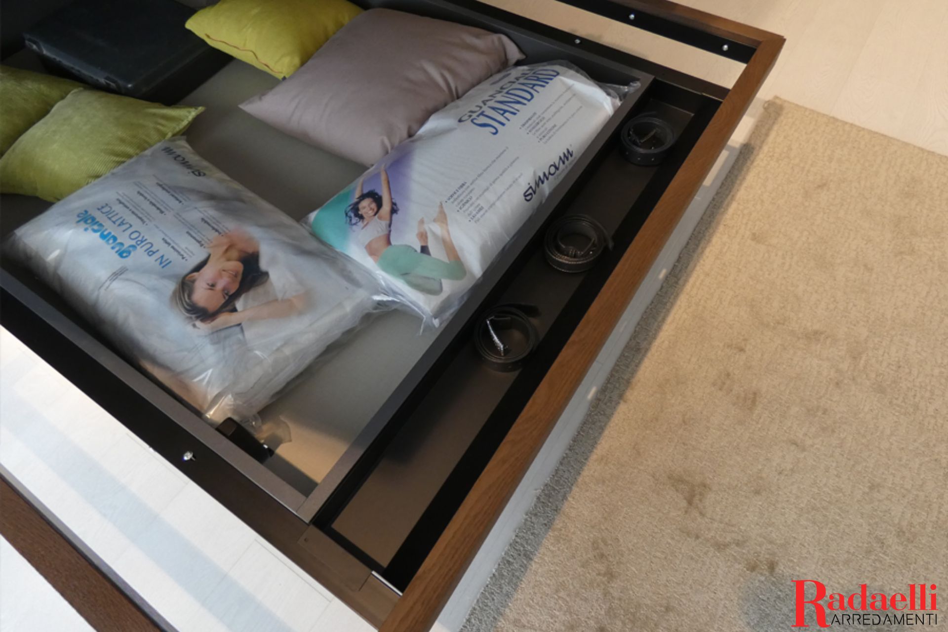 Il letto Sorvolo Fimar rappresenta una sintesi perfetta tra eleganza e funzionalità. Dotato di un pratico contenitore sospeso per tutta la sua lunghezza, questo letto non solo garantisce uno spazio aggiuntivo per riporre coperte e biancheria, ma rende anche la pulizia sotto la struttura facile e veloce, grazie al suo design sollevato da terra.