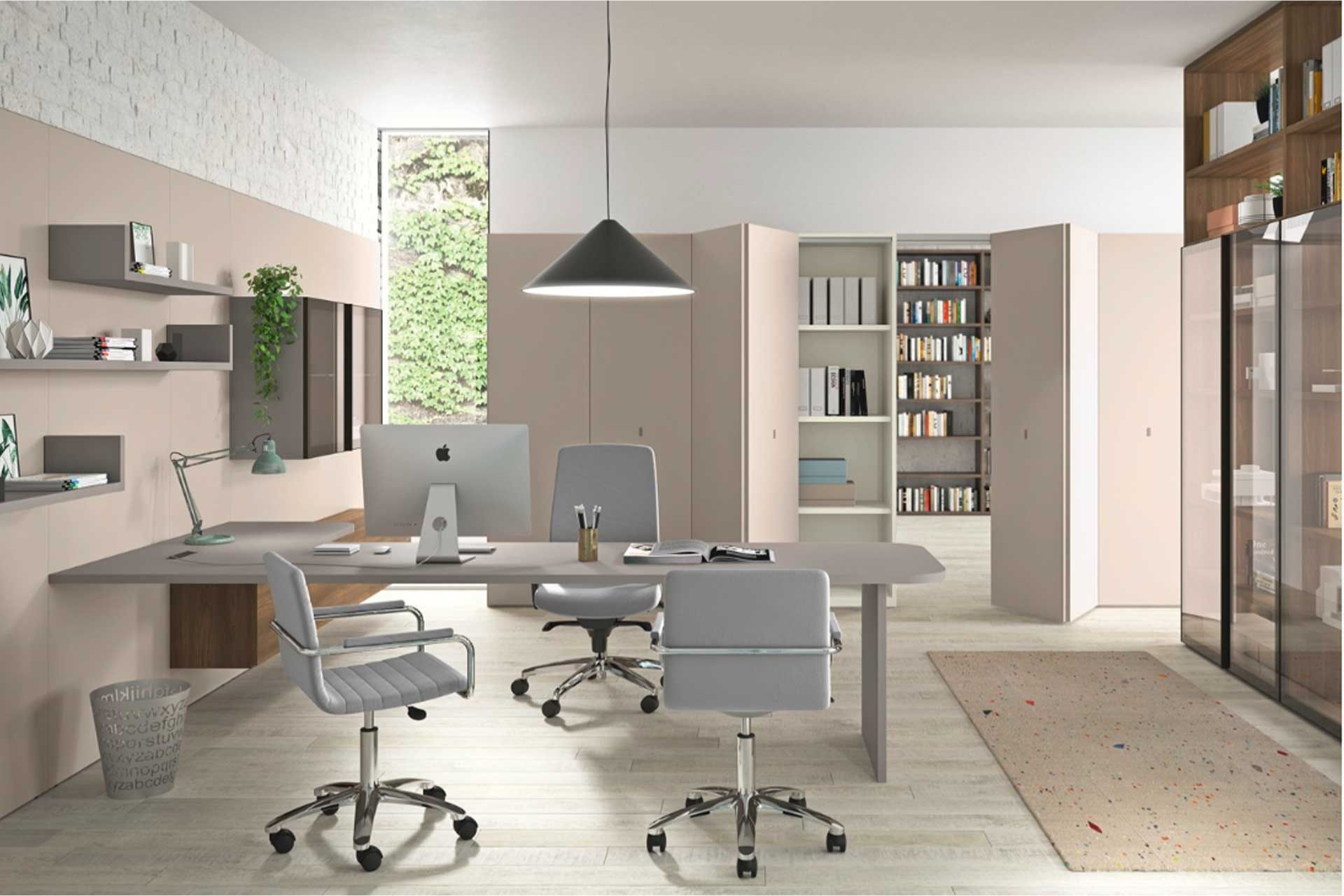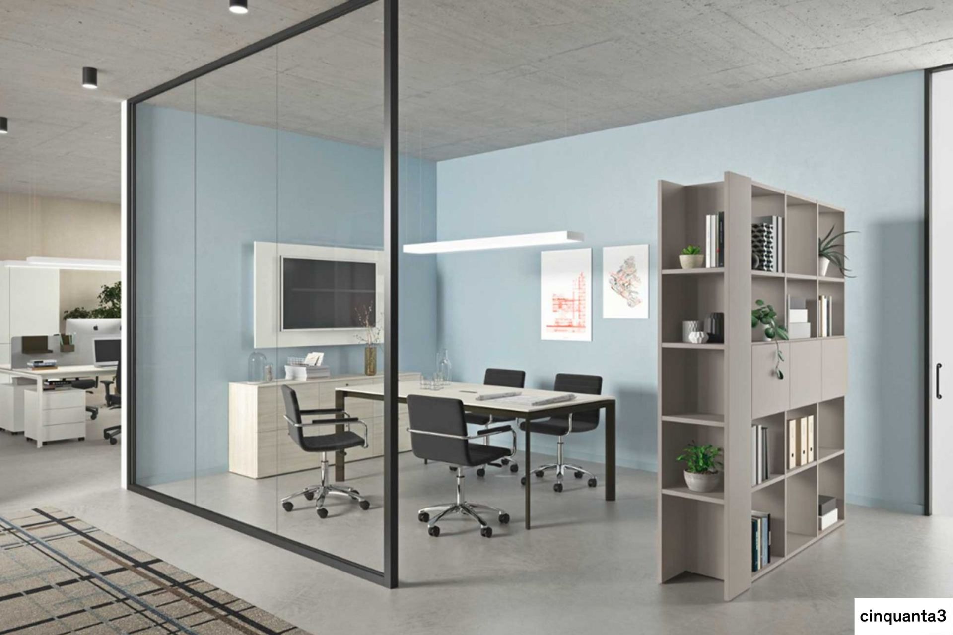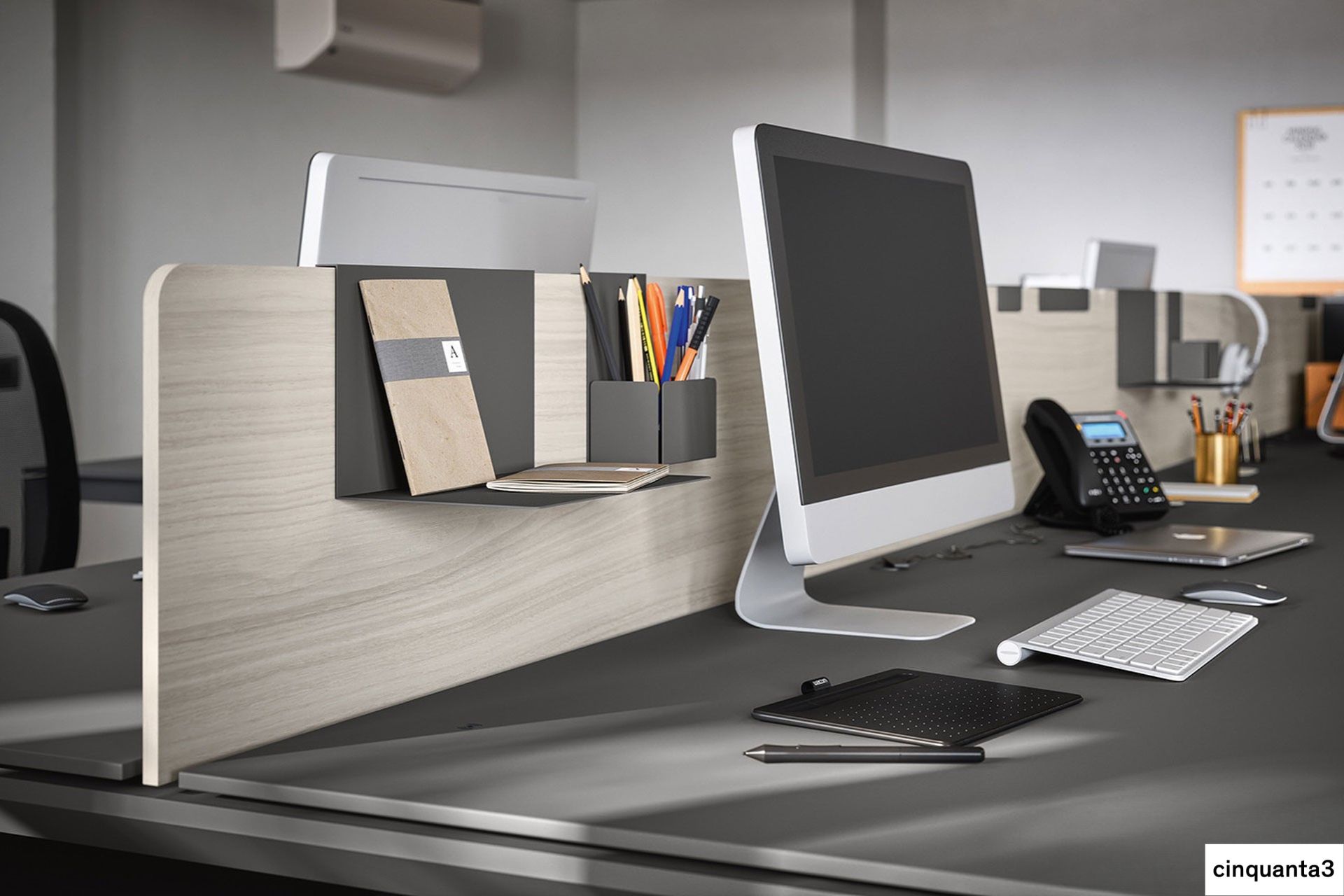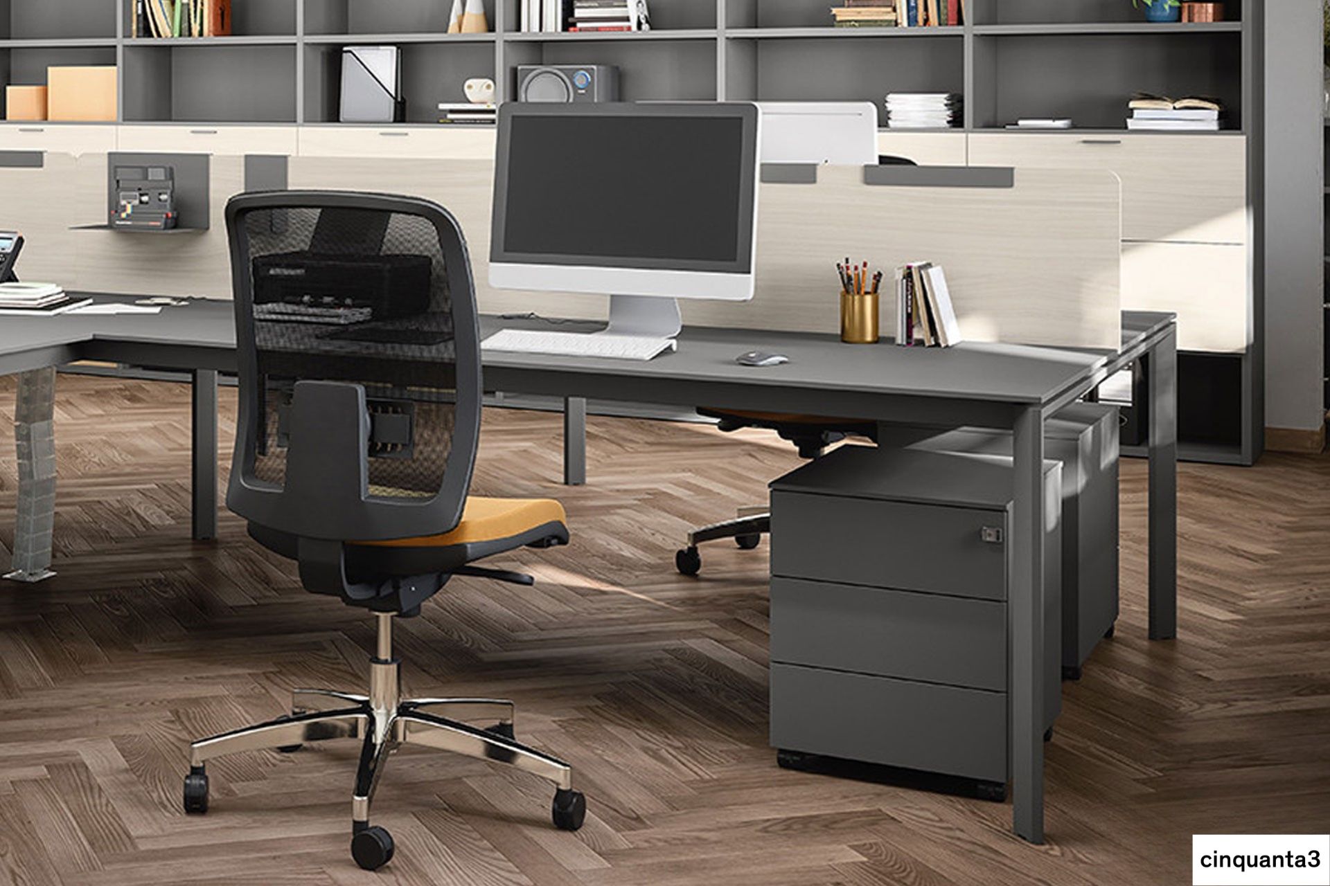 Grazie alla componibilità dei sistemi Cinquanta3, è possibile completare la postazione con librerie, contenitori, mobili di servizio e pareti attrezzate, creando un ambiente coerente e completo di tutto.