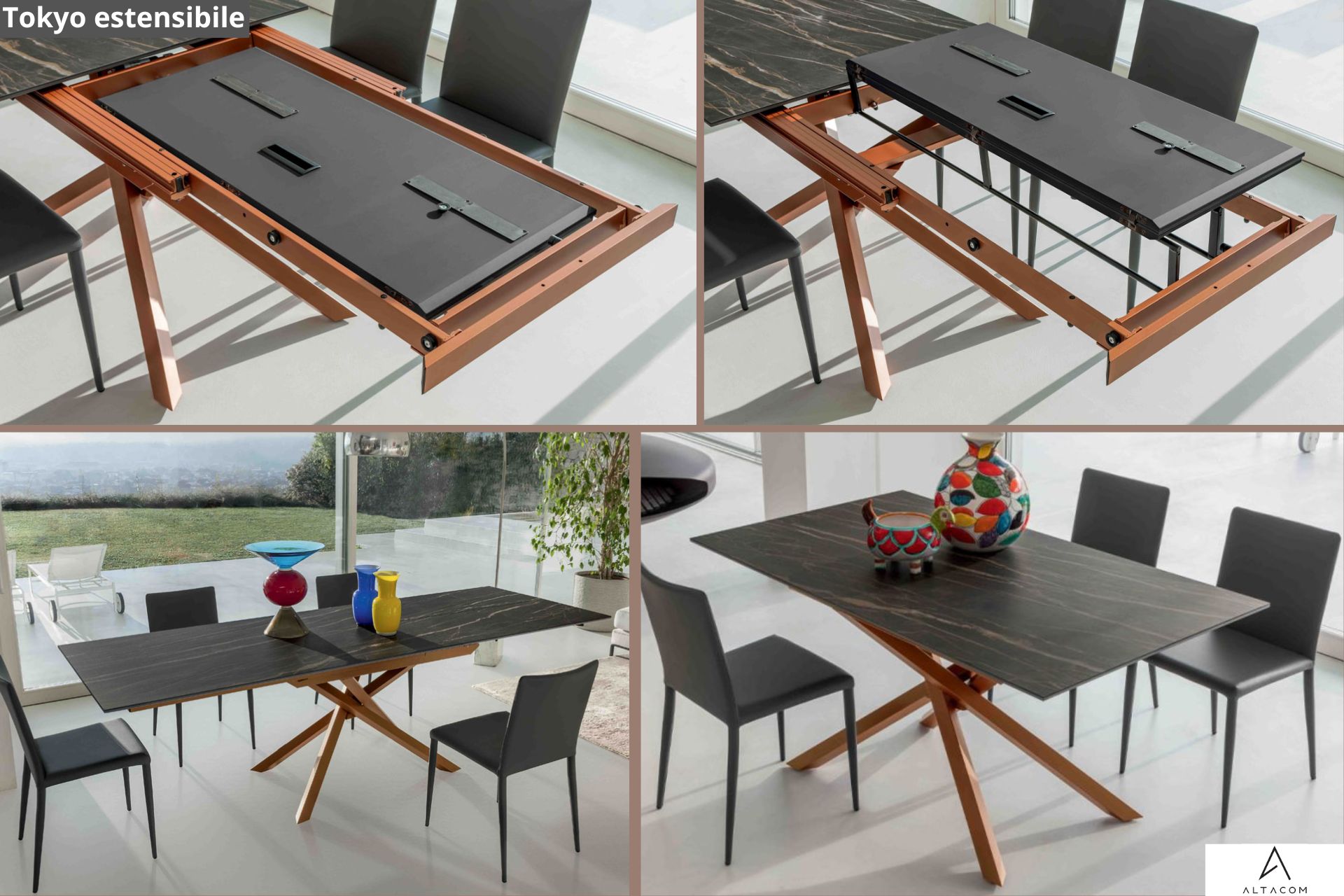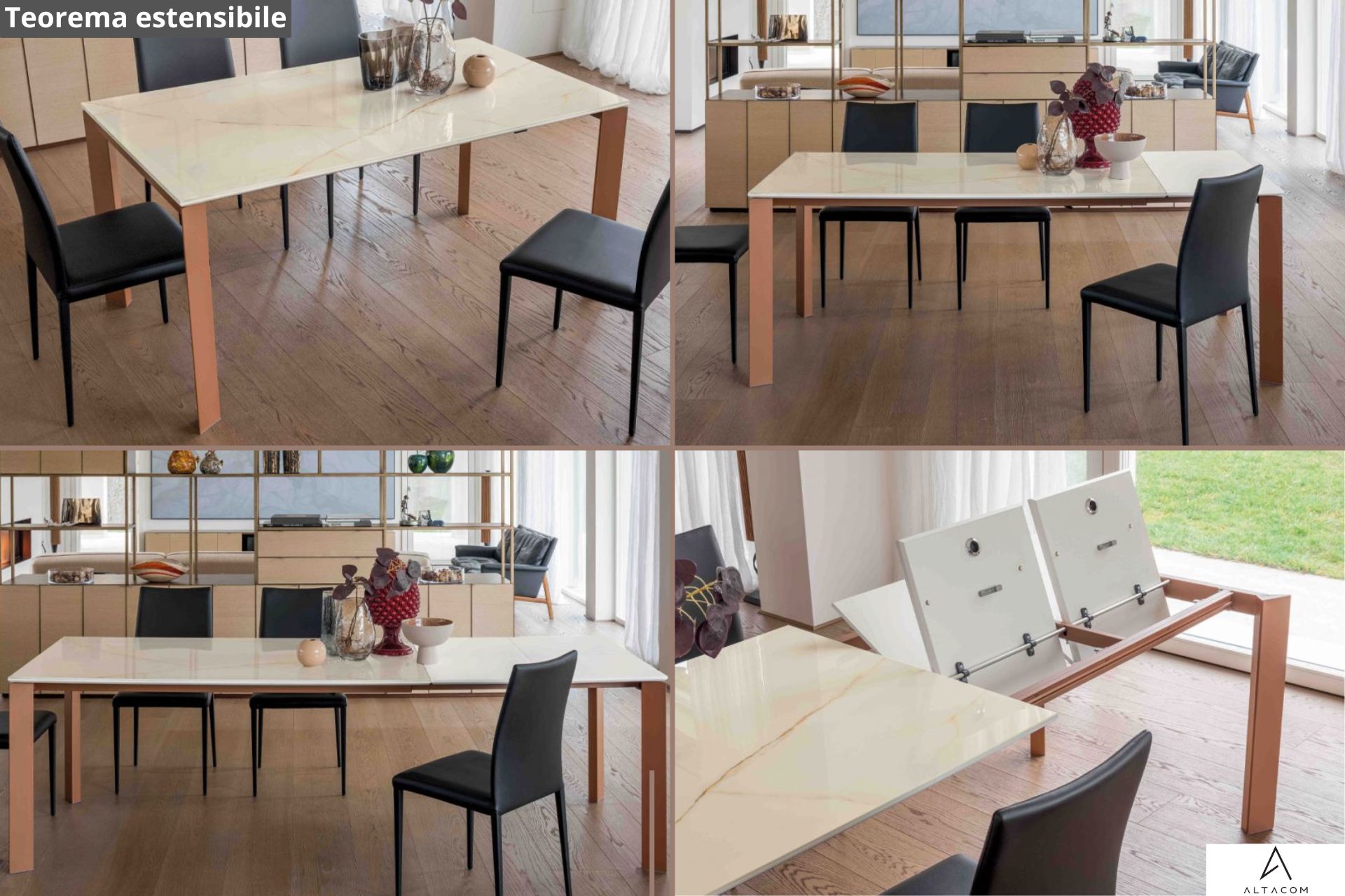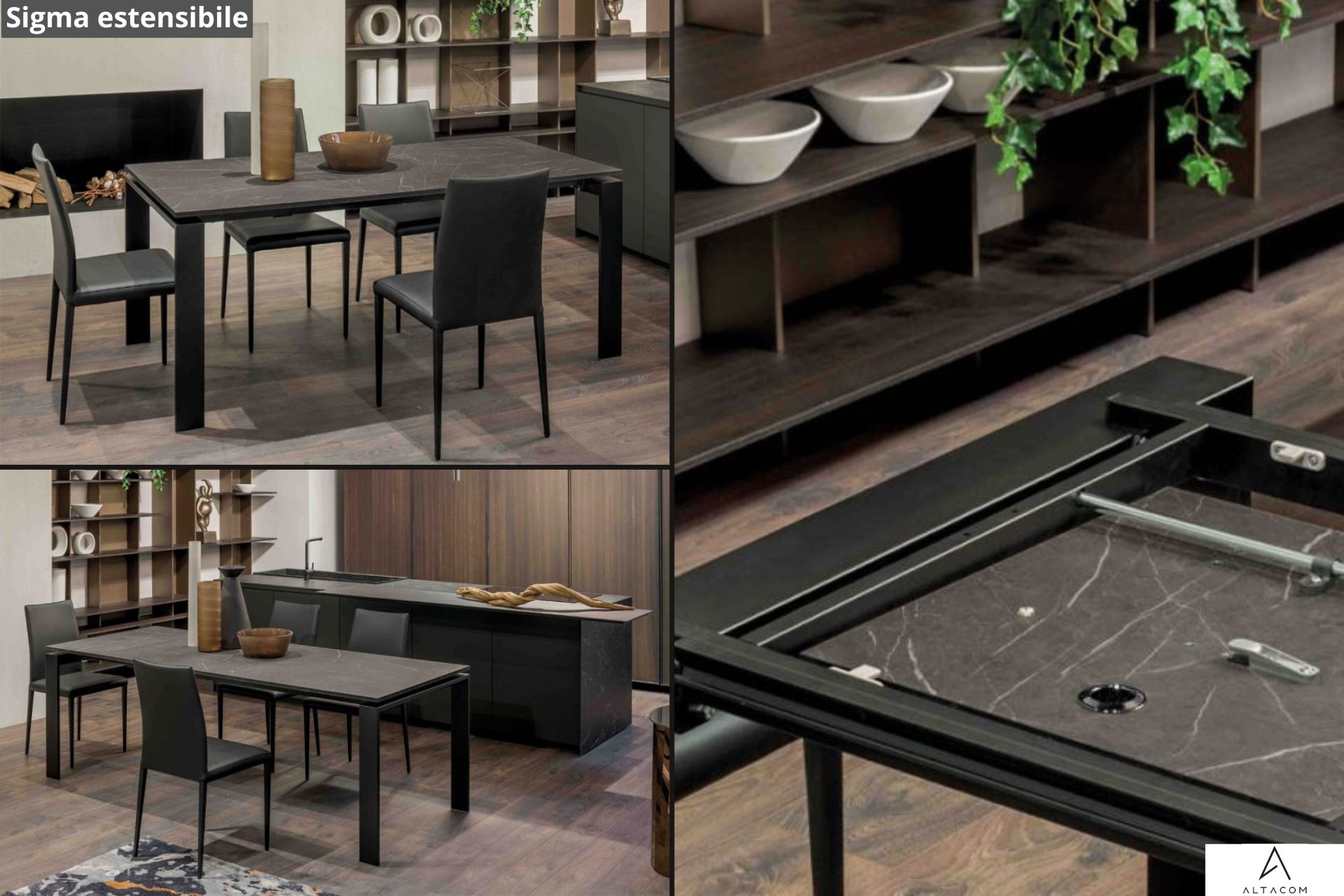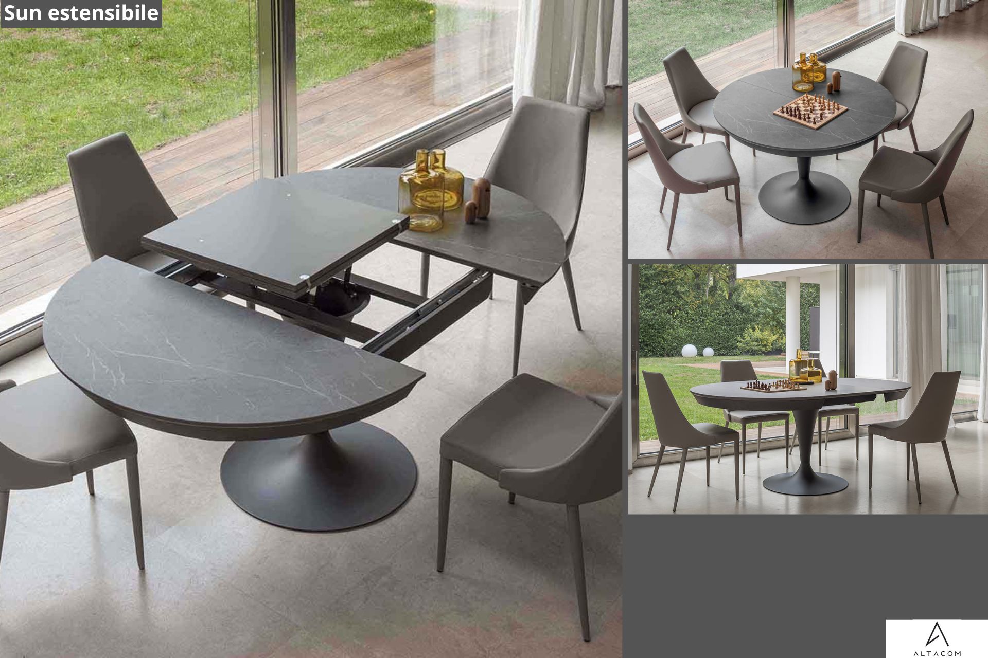 Altacom è specializzata in tavoli trasformabili e meccanismi brevettati: propone modelli versatili che si allungano con facilità, garantendo stabilità e solidità. Le finiture spaziano dal legno naturale al vetro, al gres porcellanato al melaminico.