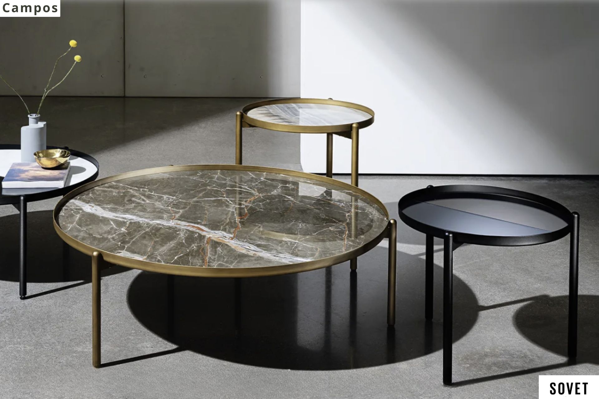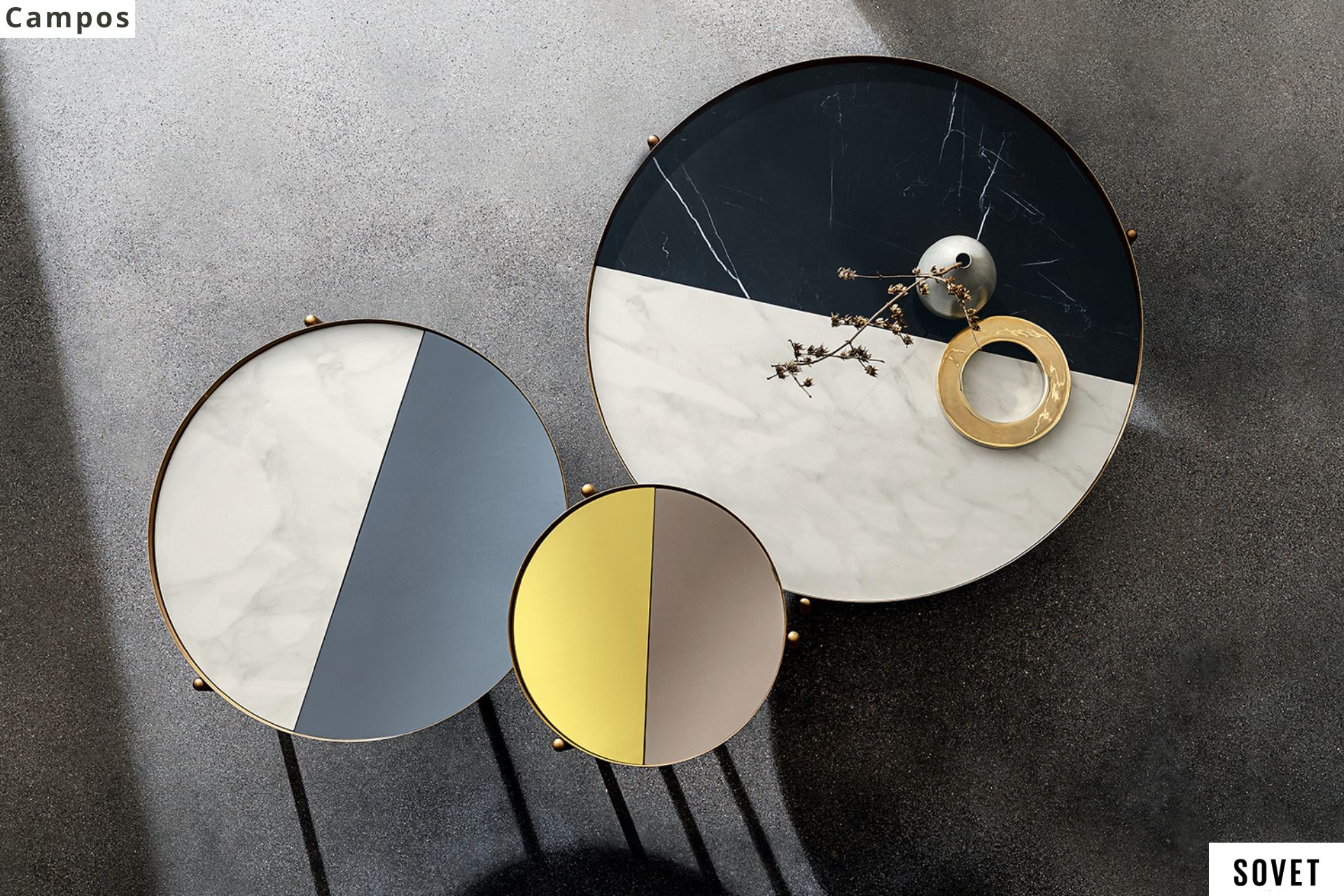 • Sovet offre tavolini in vetro, ceramica e metallo, con linee essenziali e finiture ricercate.